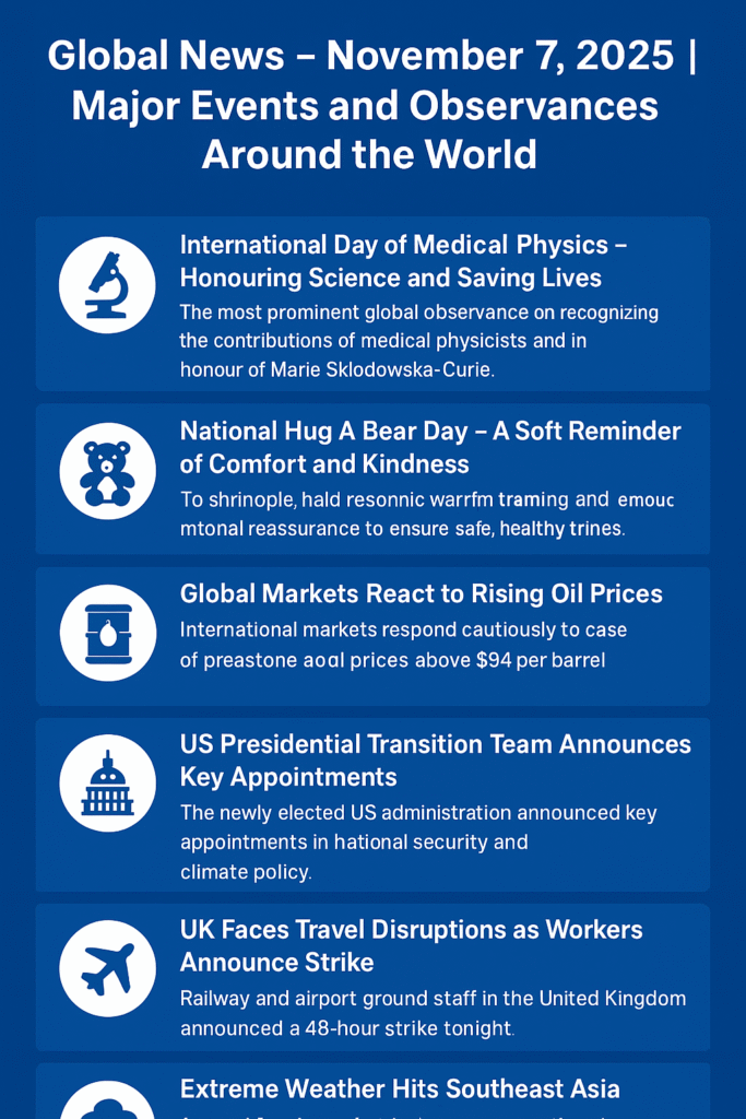ग्लोबल न्यूज़ – 7 नवंबर 2025 | विश्व की प्रमुख घटनाएँ और विशेष दिवस 7 नवंबर 2025 दुनिया भर में