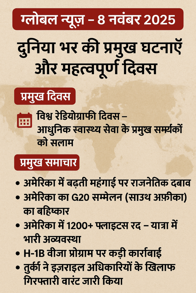 ग्लोबल न्यूज़ – 8 नवंबर 2025 | दुनिया भर की प्रमुख घटनाएं और महत्वपूर्ण दिवस 8 नवंबर 2025 दुनिया में