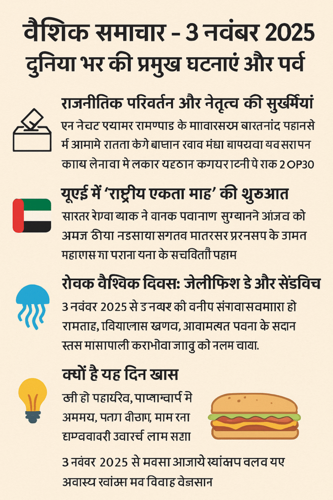 वैश्विक समाचार – 3 नवंबर 2025 | दुनिया भर की प्रमुख घटनाएँ और पर्व