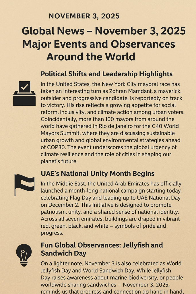 Global News – November 3, 2025 | Major Events and Observances Around the World November 3, 2025, marks another eventful